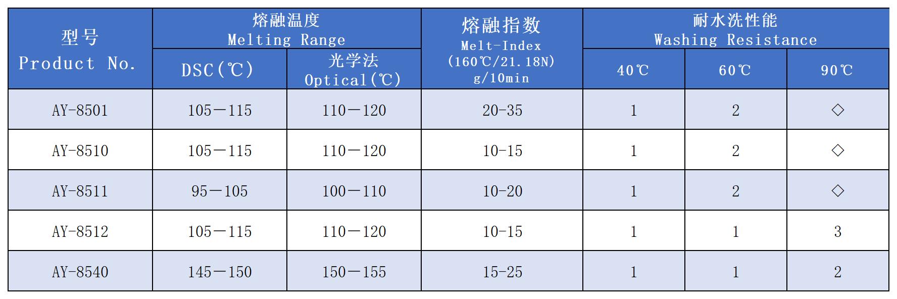 优秀的耐水洗性、耐高温性、柔韧性,可根据不同的应用工艺生产不同分子量、熔融范围、熔体流动性及不同熔解性的产品,适用于热熔胶膜、网膜、拉条及表面涂层处理等,满足100℃-200℃复合区间温度要求。