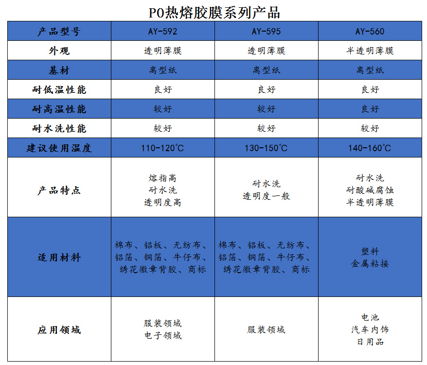PO热熔胶膜是以聚烯烃为主要原料制造的热熔胶膜产品。聚烯烃(Polyolenfine,PO)包括聚乙烯(PE)和聚丙烯(PP)。聚乙烯无毒、无味、耐低温、耐化学性好,可与其它酸类接枝共聚而极性化,从耐改善粘接性能,聚丙烯有等规聚丙烯、间规聚丙烯和无规聚丙烯,用于热熔胶基料的为无规聚丙烯,PO热熔胶膜适用于聚丙烯、聚已烯、铝板、无纺布、铝箔、铜箔、牛仔布、绣花徽章背胶、商标、工艺品、铝网烫图、纺织品等粘接。